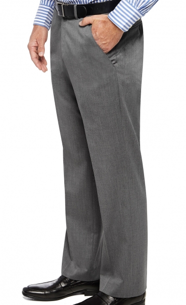 An easy care machine washable 55% polyester, 43% Austalian wool and 2% Elastane for stretch. This pant features a Flexi waist, fob pocket, slanted side pockets, two jetted buttoned-down rear pockets. Fit is a regular silhoutte, meaning no tightness through the seat and thighs and not narrow at the leg bottom.